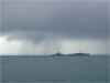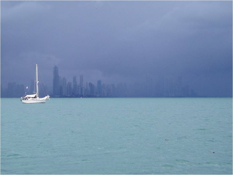 This photo shows how quickly storm cells move across the water. We beat this one and were safely anchored at Isla Contadora when it struck. |