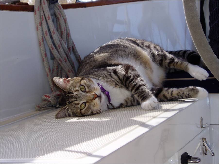 The Balboa Yacht Club has two railways for pulling boats needing maintenance. Tito runs the show and has done so for over 50 years. At last count, Tito was feeding eight cats; this kitty is Tigre, one of Tito's favorites. |