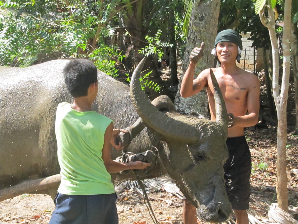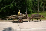 Are the national animal of the Philippines. These gentle giants seem to serenely amble through their burdens. These children had been riding on a sled towed behind before the line to the yoke broke. |