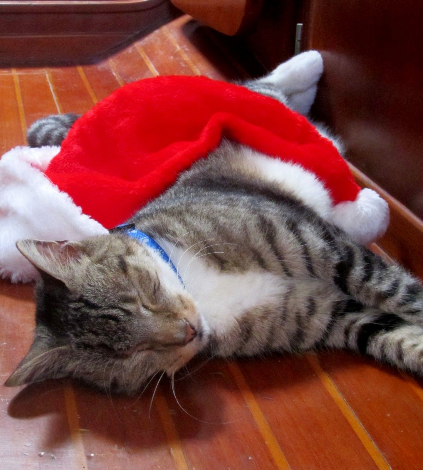 cat refused to pose for me, so I had to wait until he fell into a deep sleep before draping the elf cap over him. At some point he had to sleep off his nocturnal wanderings. |