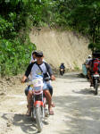 challenging road, motorbikes burdened with people and cargo zoom along. |