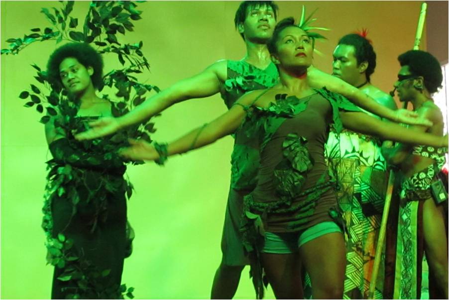 a human/bird character dancing with Uli, the young Fijian character who falls in love with Uli. USP dramatic arts personnel visited the Lau group to research the Drua culture wherein in the late 19th century collaborative efforts around the Pacific perfected the sail design of the canoes, allowing them to be fast. |