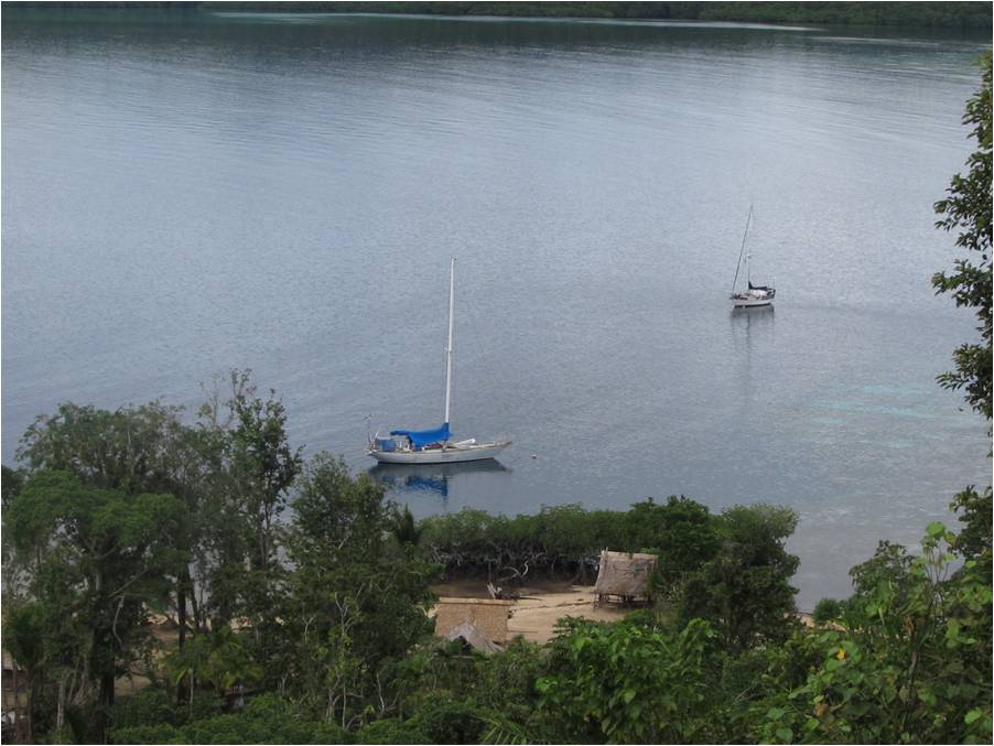 One Sunday early in September we waited until showers cleared, dinghied to the far end of Roderick Bay and climbed through the thick jungle on a slippery trail to meet Ben, the paramount chief of the region who lives on his teak farm at the top of the island. As we climbed we could spy Carina bobbing merrily at anchor. |
