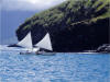 Tom and Anne of the sailboat Leonidas own this aluminum, double-masted, sprit-rig sailing canoe which Tom's dad bought in 1952. Though anchored in an adjacent bay on Ile Tahuata, they sailed over to Carina for a visit. |