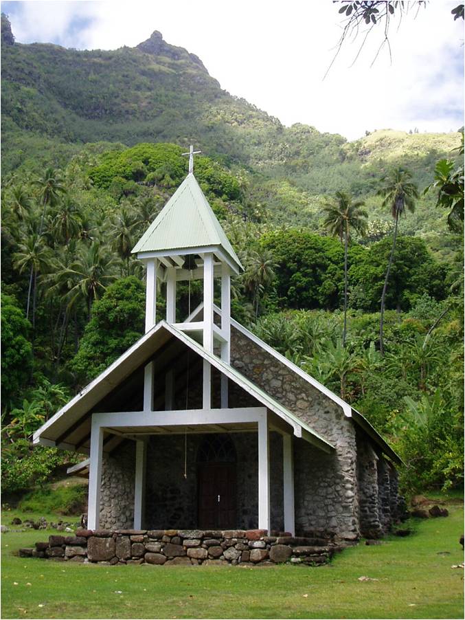 The village of Hapatoni is "tres jolie" - perhaps the prettiest we've seen. It's ancient stone lined uapu (road) is shaded by equally ancient temanu trees and the entire town is manicured with a park-like tranquillity. |