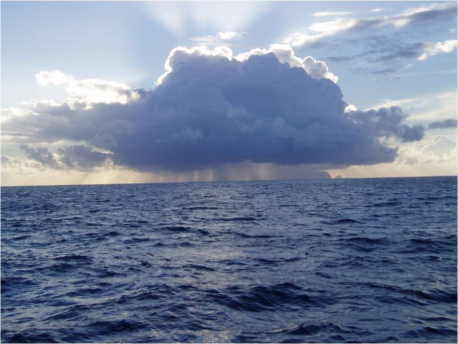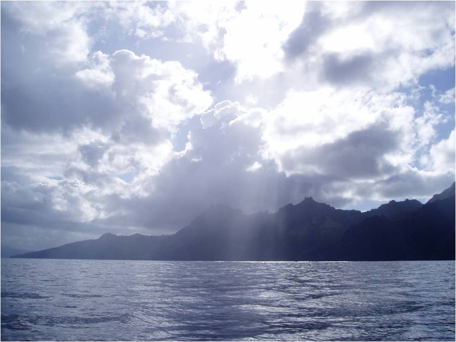 This isolated and somewhat compact storm cloud appeared as we made our approach to Ile Tahuata. Luckily, it slipped off to our stern. |