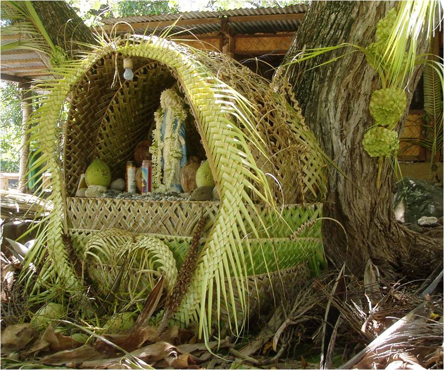 A day we visited Hapatoni woman were gathered together weaving palms in intricate designs to form shrines. This shrine included a statue of Virgin Mary with a plumeria lei, candles and other small offerings. We later learned that there would be four shrines and Mary would be moved between them over the month of May. |