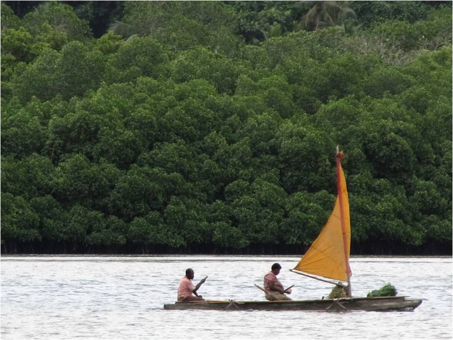 During a period of brisk winds at Aewi Island, we suddenly saw dugouts being propelled the easy way - by sail! |