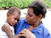 The folk of the crowded villages in the Maskelynes maintain gardens on "mainland" Malakula island. This day over 10 dugouts of women cruised by Carina on their way to collect food for the upcoming Vanuatu Independence Day. |