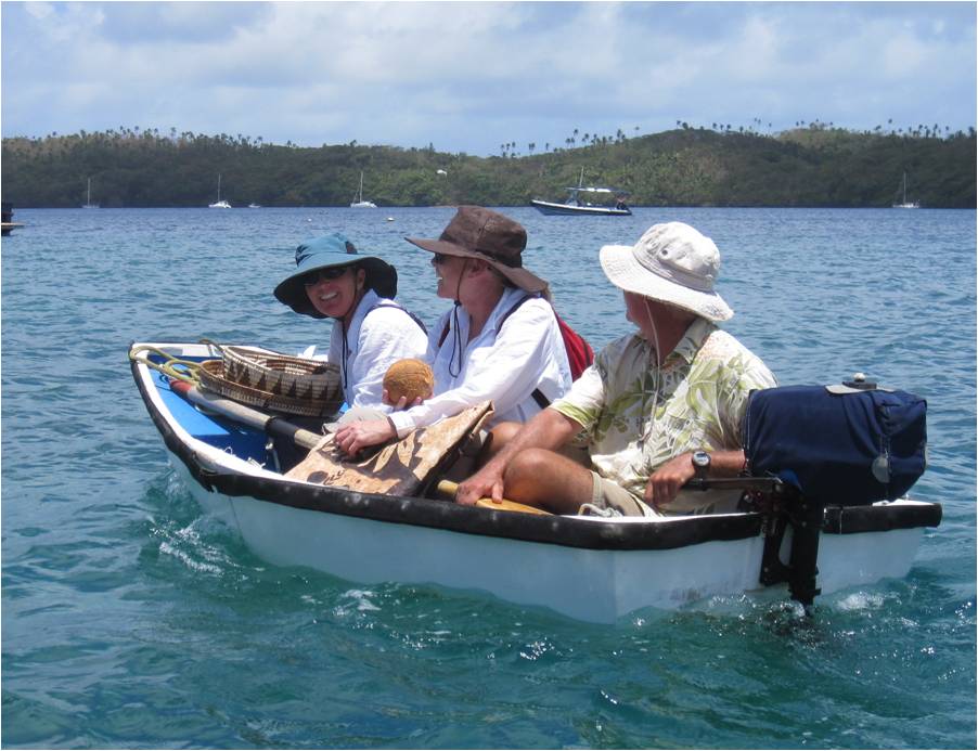 Peter and Betiola of the Pangaimotu island stopped by Carina to sell and trade wood carvings, woven baskets and grass skirts. |