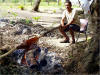 We had been told to meet Ben and Fa'aki of Matamaka by friends. In Jan 2010, while anchored nearby at Vaka'eitu, Ben and Fa'aki Fifita came by our boat and invited us to their village. On Sunday, January 24, we had an expedition aboard Carina with friends Larry, Ed and Ingemar. When we arrived Ben was preparing the main course for lunch - a month old piglet - spit roasted or tunu-style. |