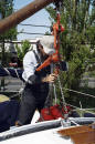 had advantages; Philip's desk was less than a half of a mile from the boat. Port Townsend Rigging spyed Philip on his lunch hour working and just had to capture this funny scene. |